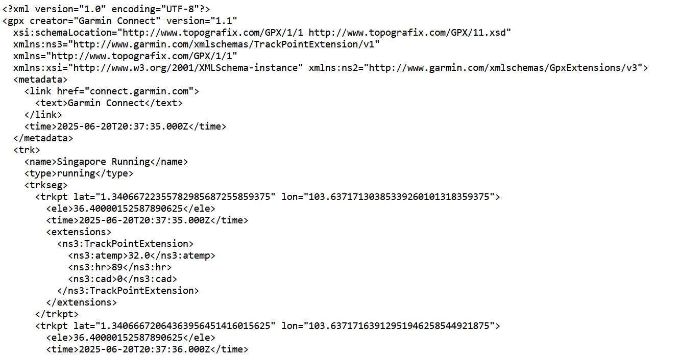 The first step was to get a copy of the run GPX file from my garmin account. GPX stands for GPS Exchange Format and is an open xml standard, interopable across various different tools and applications. Each activity on garmin has a corresponding GPX file, that can we easily downloaded using the garmin connect website. The xml contains various pieces of metadata along with many datapoints taken frequently during the activity, including time, longitude, latitude and temperature. A sample of the GPX is shown below.