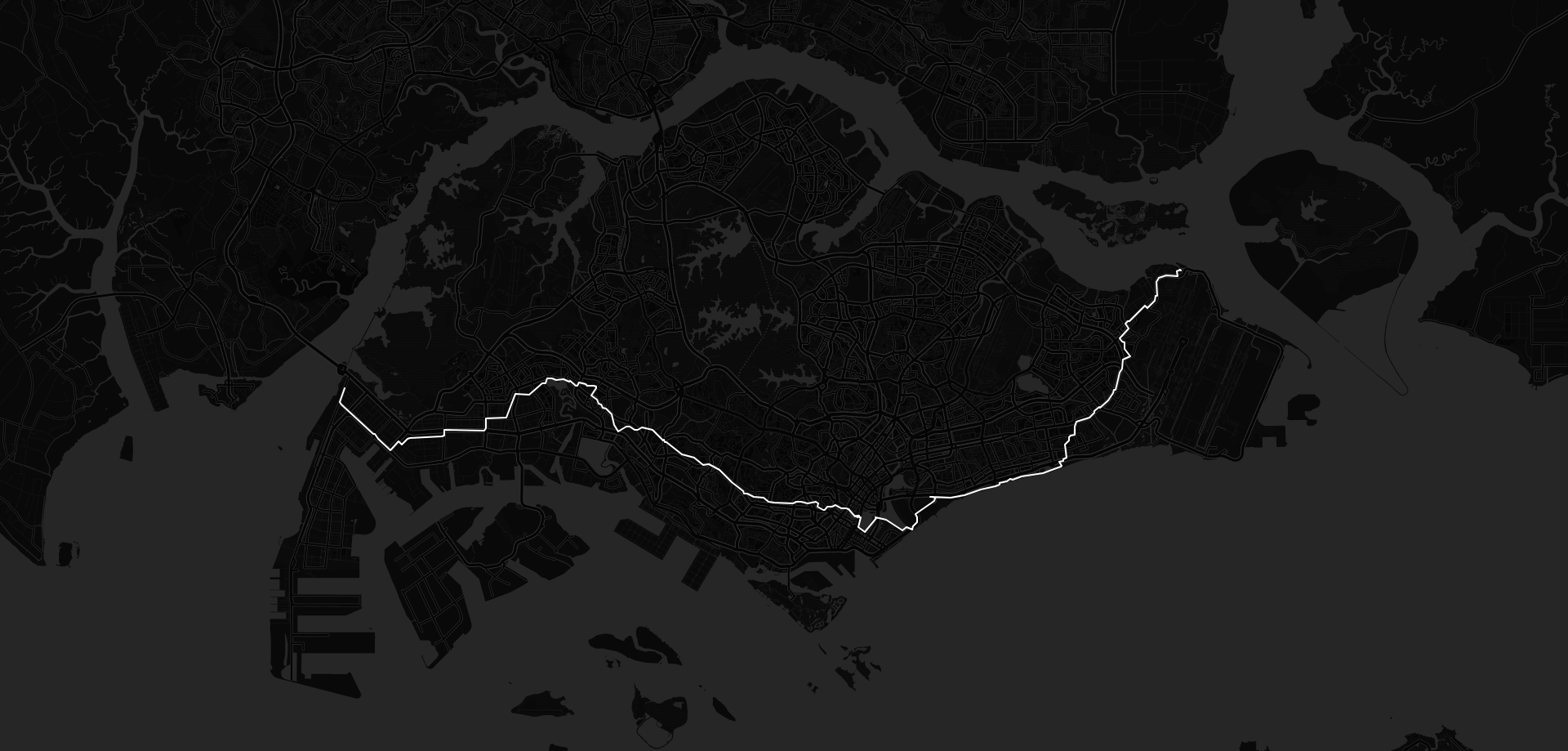 The hardest part of the whole endeavour was cleaning up the data in the GPX file. As ever, the least fun parts take the most amount of time. At various points, the route contained minor inaccuracies in the GPS data. The easiest thing to do was to remove these data points from the set by using a gpx viewer online to determine the longitude and latitude. The leaflet library fills in the gaps in the route with a straight line so the that the output is continuous. The discrepancies were most noticeable whenever we stopped for a break and were either indoors or surrounded by tall buildings. Once these were cleaned up, the output was a smooth line joining Tuas in the east of Singapore, to Changi Village in the west.